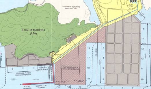Ainda segundo a mesma autora, os investimentos a serem realizados levavam em conta determinadas condições existentes na região: possibilidade de acesso marítimo com profundidade de 14 a 18 metros, para acomodar calados de embarcações de até 8.000 TEUs; acesso terrestre livre de entraves físicos ou de impedimentos regulatórios; condições de expansão para atender ao crescimento da demanda; e localização em área de baixo impacto ambiental (p. 5). A favor do projeto, já existiam no local, desde o início da década de 1980, dois terminais para transporte de minério (carvão e alumina), que sinalizavam que podia ser viabilizada a entrada de grandes navios, através da dragagem do canal principal. Contudo, é preciso não perder de vista que, na justificativa de “ampliação” do porto de Sepetiba, o transporte de graneis (líquidos e sólidos) era secundário, sendo o transporte de mercadorias conteinerizadas de alto valor agregado o leitmotiv da proposta. Ou seja, seria muito mais do que uma ampliação.