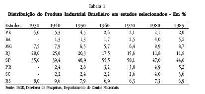 Box 1. Como podemos observar na Tabela 1, que mostra a distribuição do Produto Bruto Industrial Brasileiro entre estados selecionados, em 1930 Sã Paulo já estava em primeiro lugar com 35% e Rio de Janeiro em segundo com 28%; em 1950, essa diferença se estica para 48,9% em São Paulo e diminui para 20,3% no Rio de Janeiro; em 1970, no auge da industrialização da metrópole paulistana, São Paulo alcança inacreditáveis 58,1%, enquanto no Rio de Janeiro a mesma continua a diminuir: 17,5%. Por fim, no último ano do período analisado, já em pleno processo de abertura democrática, o vertiginoso crescimento de São Paulo tinha diminuído para 44%, mas o do Rio de Janeiro também: 11,8%.