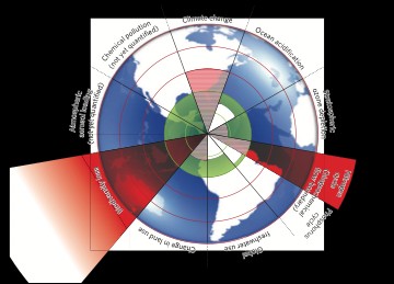 O trabalho de Armstrong McKay e colegas se coloca numa linha de continuidade com o trabalho de outro científico sobre o colapso climático como ponta do iceberg do fenómeno mais amplo da ultrapassagem dos limites da biosfera, tema sobre o qual Röckstrom publicou ao final da década passada um artigo sobre o que ele e seus coautores/as definiram ‘um espaço de segurança para a humanidade (ROCKSTRÖM et al., 2009b). Na figura 3, o sombreado verde interno representa o espaço operacional seguro proposto para nove sistemas com alcance planetário. As fatias vermelhas representam uma estimativa da posição atual de cada variável. Os limites de três sistemas (taxa de perda de biodiversidade, alterações climáticas e interferência humana no ciclo do azoto) já foram ultrapassados.