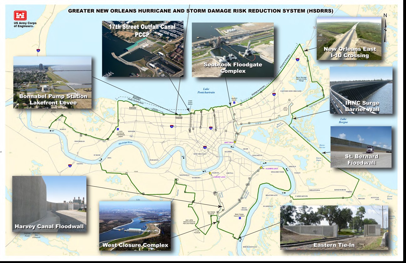 O Corpo de Engenheiros do Exército dos EUA afirma que as barreiras ao nível do mar em Nova Orleans são um excelente exemplo de soluções criativas de engenharia, utilizando portões de grande escala, diques reforçados e sistemas de bombeamento de ponta, entre outros designs e tecnologias criativas para enfrentar de desafios tecnológicos e hidrológicos (U.S. ARMY CORPS OF ENGINEERS, 2014).
