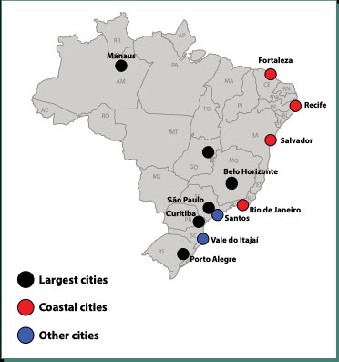 Figure 2. Maiores cidades Brasileiras e destaque das Cidades Costeiras (vermelho)